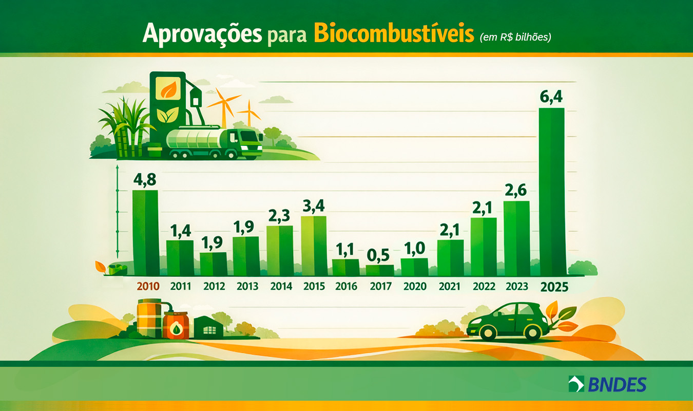 O Banco Nacional de Desenvolvimento Econômico e Social (BNDES) aprovou R$ 6,4 bilhões em crédito para produção de biocombustíveis em 2025. O valor supera o realizado em 2010, quando a instituição aprovou R$ 4,8 bilhões, montante considerado o maior até então.
