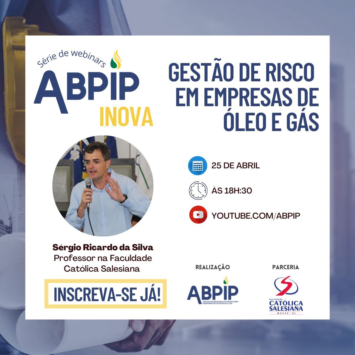 O webinar gratuito é uma iniciativa da Associação Brasileira dos Produtores Independentes de Petróleo e Gás (ABPIP) e nesta edição vai contar com a participação do professor Sérgio Ricardo da Silva, da Faculdade Católica Salesiana. As inscrições já estão abertas e podem ser feitas no link https://lnkd.in/dJzSyN9b.