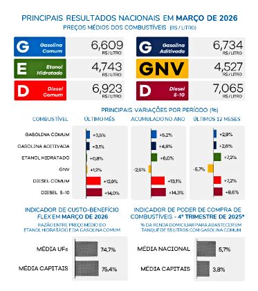 Os preços dos combustíveis encerraram março em forte alta no Brasil, com o diesel no epicentro das pressões e atingindo os maiores níveis médios nacionais desde agosto de 2022. o diesel S-10 subiu 14,0% e o diesel comum, 12,9%, refletindo o reajuste de R$ 0,38 por litro promovido pela Petrobras em meados de março e o repasse ao consumidor final. As gasolinas tiveram alta mais moderada — 3,5% na comum e 3,1% na aditivada —, enquanto etanol (+0,8%) e GNV (+1,2%) registraram variações mais contidas.